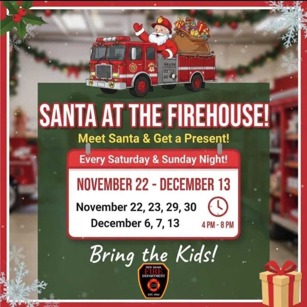 The New Miami Fire Department warmly invites all kids to come and meet Santa, starting November 22, 2025, from 4 p.m. to 8 p.m. Santa will be handing out toys every Saturday and Sunday night until December 13, 2025. We appreciate the donations we've received and welcome additional donations of neutral gender toys. Your presence, not presents, is what matters; we look forward to sharing a delightful experience with you.